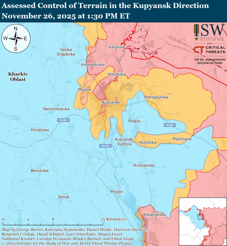 У центральній частині Куп'янська російські сили зуміли просунутися, проте заглиблення в місто створило загрозу для них самих: вузький коридор постачання робить угруповання вразливим для потенційного оточення. Також спостерігається активізація російських атак у районах Петропавлівки, Піщаного і Степової Новоселівки. Українські військові утримують раніше відбиті позиції в напрямку Борової.