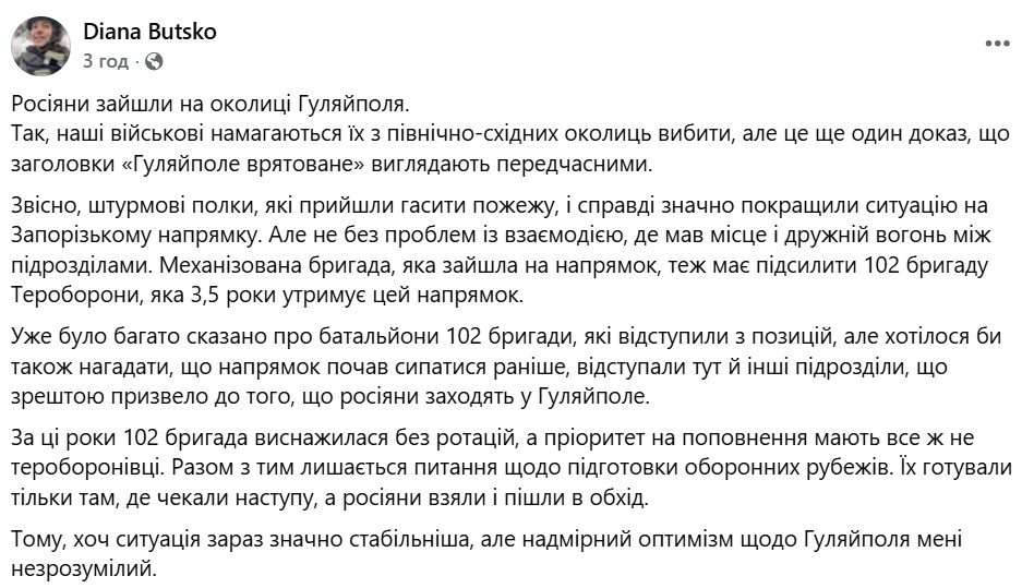 На Гуляйпільському напрямку 3,5 роки стояла 102 бригада тероборони ЗСУ, а тепер їй на допомогу прийшли штурмові підрозділи та перекинули механізовану бригаду, написала на сторінці Facebook журналістка "Громадське" Діана Буцко. З її слів, росіяни проникли на північно-східні околиці села і їх звідти намагаються вибити. Також уточнюється, що заяви про "Гуляйполе врятоване" насправді передчасні.