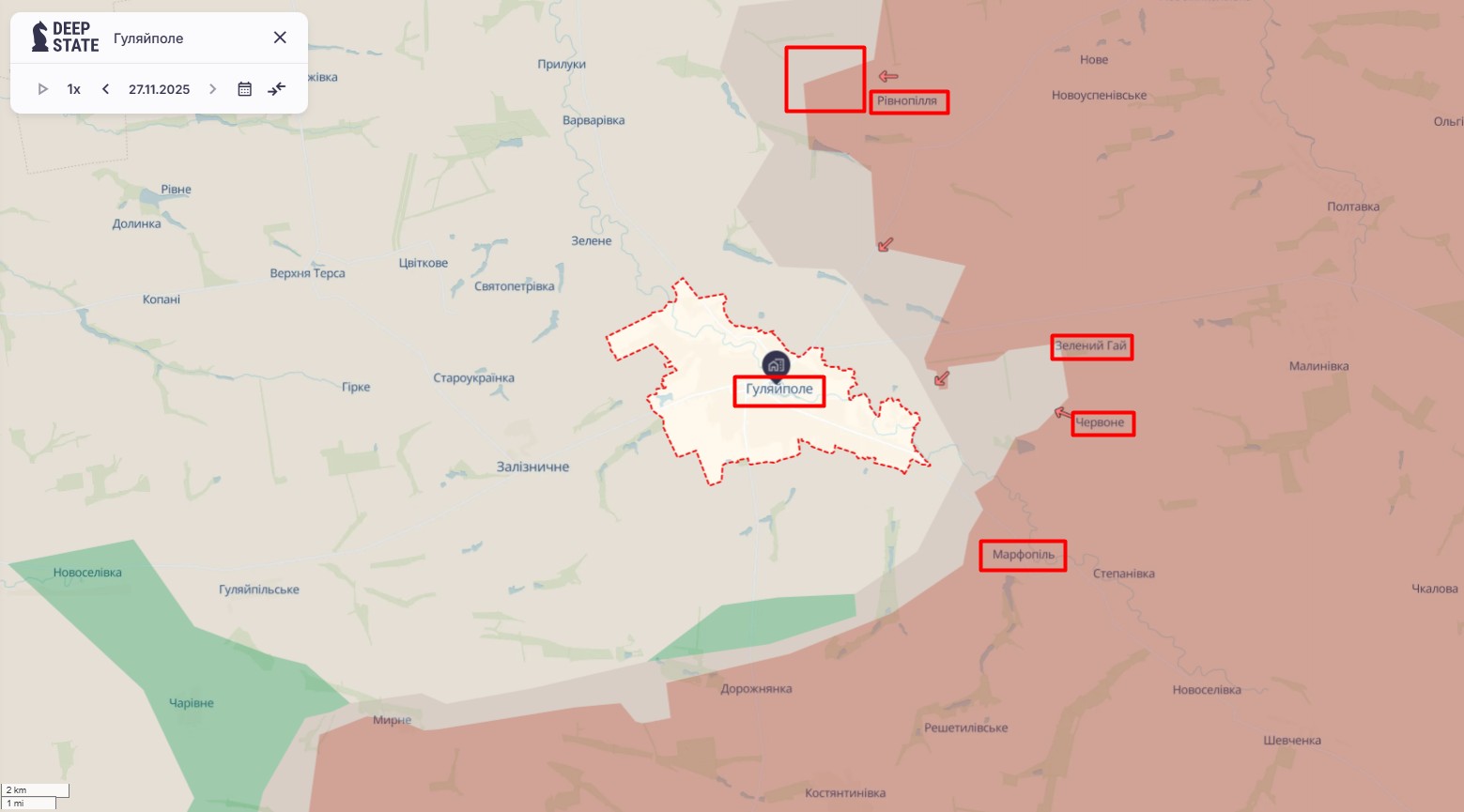 На карті аналітиків DeepState показана лінія фронту біля Гуляйполя та напрямки атак ЗС РФ. Бачимо червоний виступ у напрямку північно-східних околиць села, при чому край сірої зони, в якій відбуваються бої, на відстані 500 м від межі населеного пункту. Сіра зона тягнеться далі на схід, а червона — утворює "кишеню" розмірами 4 на 4 км. На дні "кишені" — село Зелений Гай, про окупацію якого аналітики повідомили 27 листопада.