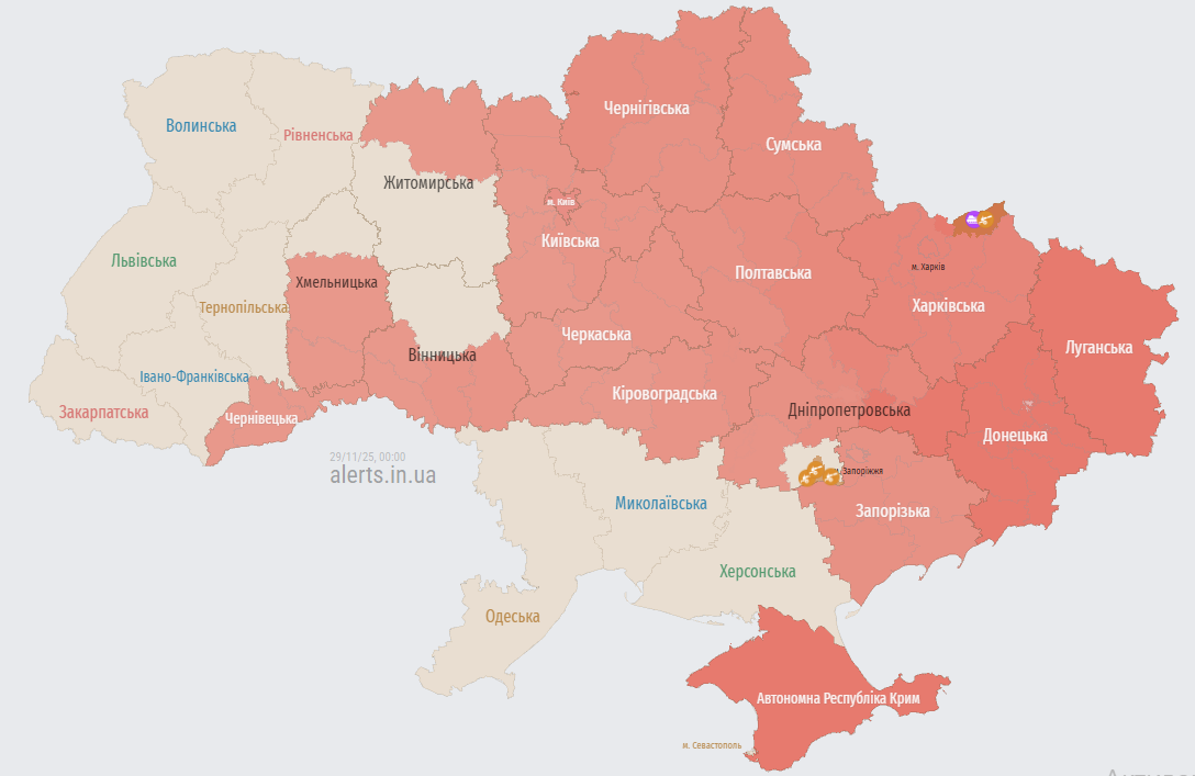 Через атаку безпілотників близько опівночі у багатьох областях України було оголошено повітряну небезпеку, свідчить мапа повітряних тривог.