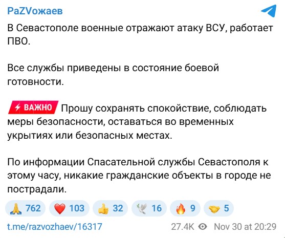 "У Севастополі військові відбивають атаку ЗСУ, працює ППО. Всі служби приведені в стан бойової готовності. За інформацією Рятувальної служби Севастополя, на цей час жодні цивільні об'єкти в місті не постраждали", — пише чиновник у соцмережах.