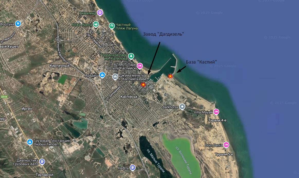 Група безпілотників дісталась Дагестану у Російській Федерації та атакувала цехи суднобудівного заводу "Дагдизель" у Каспійську. Крім того, під ударом міг опинитись порт, у якому дислокуються військові кораблі РФ. Місцева влада підтвердила атаку. Наслідки повітряного удару зафіксували на серії відео з кадрами роботи засобів протиповітряної оборони. На одному з них — яскравий спалах не у небі, а на землі.