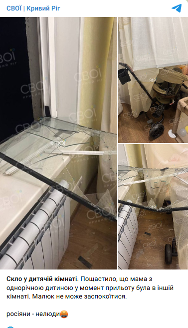 В Telegram-каналі "Свої. Кривий Ріг" очевидці опублікували фото розбитих всередину шибок у дитячій кімнаті. Маму та її однорічну дитину врятувало тільки те, що в момент прильоту вони були в іншій кімнаті.