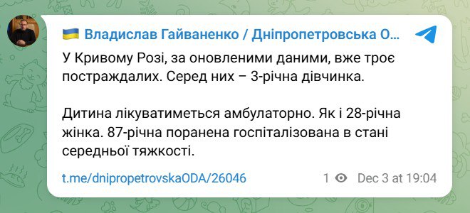 Пізніше т.в.о. голови Дніпропетровської обласної військової адміністрації Владислав Гайваненко повідомив, що, за оновленими даними, у Кривому Розі відомо про трьох постраждалих. Серед них — трирічна дівчинка. Двох жінок, яким 28 і 87 років, госпіталізували в стані середньої тяжкості.
