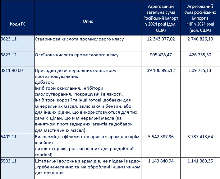 - імпорт жирних кислот у 2024 році — приблизно 11 тис. тонн за 13 млн дол. З цього об'єму п'ята частина — китайська: орієнтовно 2300 тонн за 3,1 млн дол.;