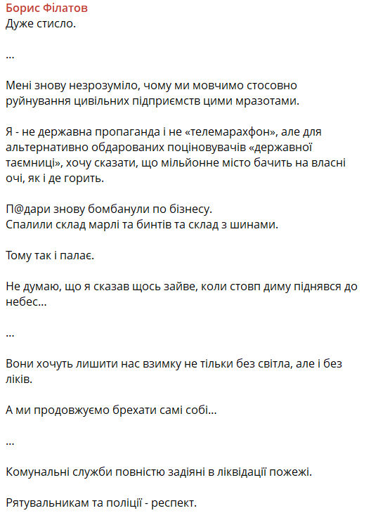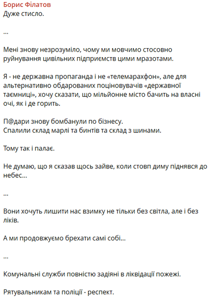 "Не думаю, що я сказав щось зайве, коли стовп диму піднявся на небо... Вони хочуть залишити нас узимку не лише без світла, а й без ліків. А ми продовжуємо брехати самі собі...", — констатує Філатов.