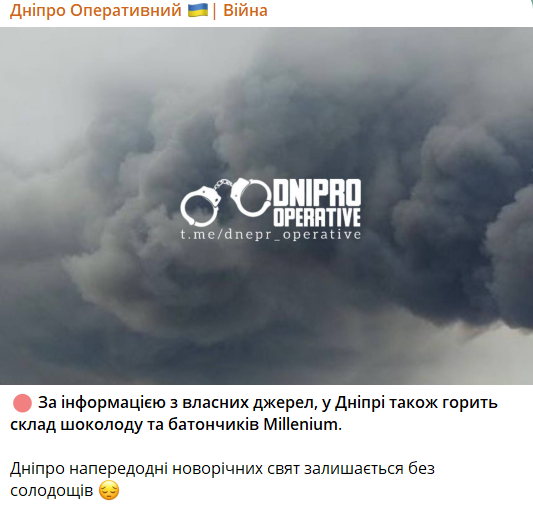 Місцеві ЗМІ також повідомляють про те, що в місті після атаки горить склад шоколаду і батончиків Millenium. Компанія поки що інформацію не коментувала.