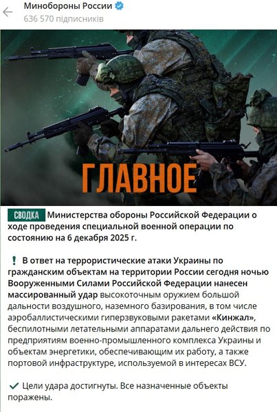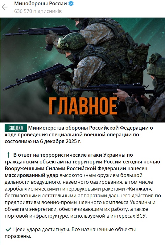 "Першого удару завдано о 00:40 (МСК) по Чернігову та Фастову. Потужні вибухи лунали в Київській, Харківській, Одеській, Чернігівській, Дніпропетровській, Вінницькій, Полтавській, Хмельницькій, Запорізькій, Сумській та інших областях. Аж до 9-ї години ранку понад 60 цілей було оброблено Геранями, ракетами "Іскандер-М", "Кинджал", "Калібр". Завдано непоправної шкоди по тилу ворога", — йдеться в публікації.