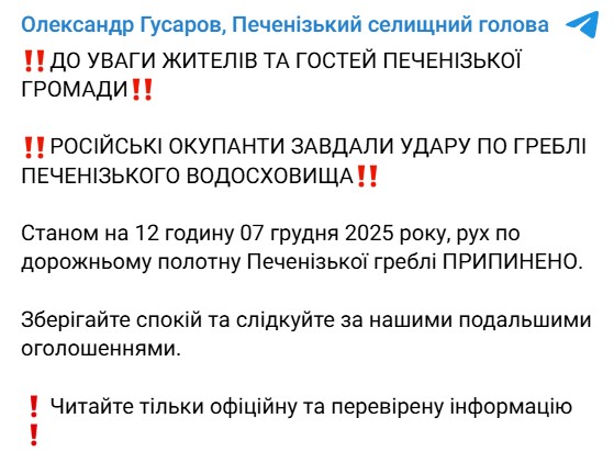 "Російські окупанти несли удар по греблі Печенізького водосховища. Станом на 12 годину 07 грудня 2025 року, рух дорожнім полотном Печенізької греблі припинено. Зберігайте спокій та слідкуйте за нашими подальшими оголошеннями", — йдеться в повідомленні.