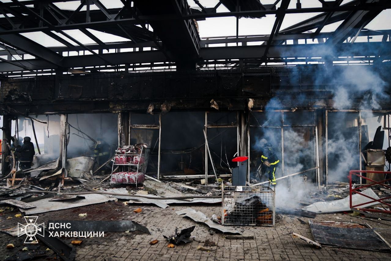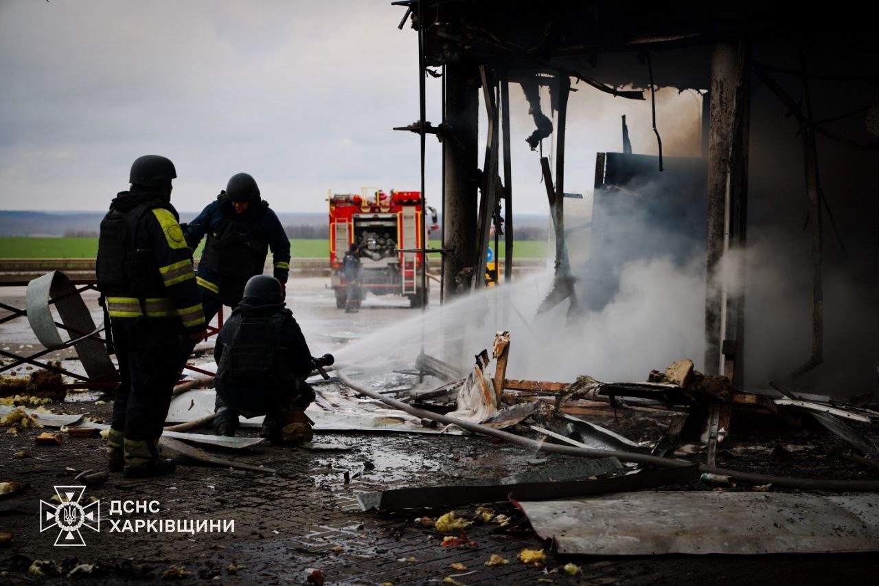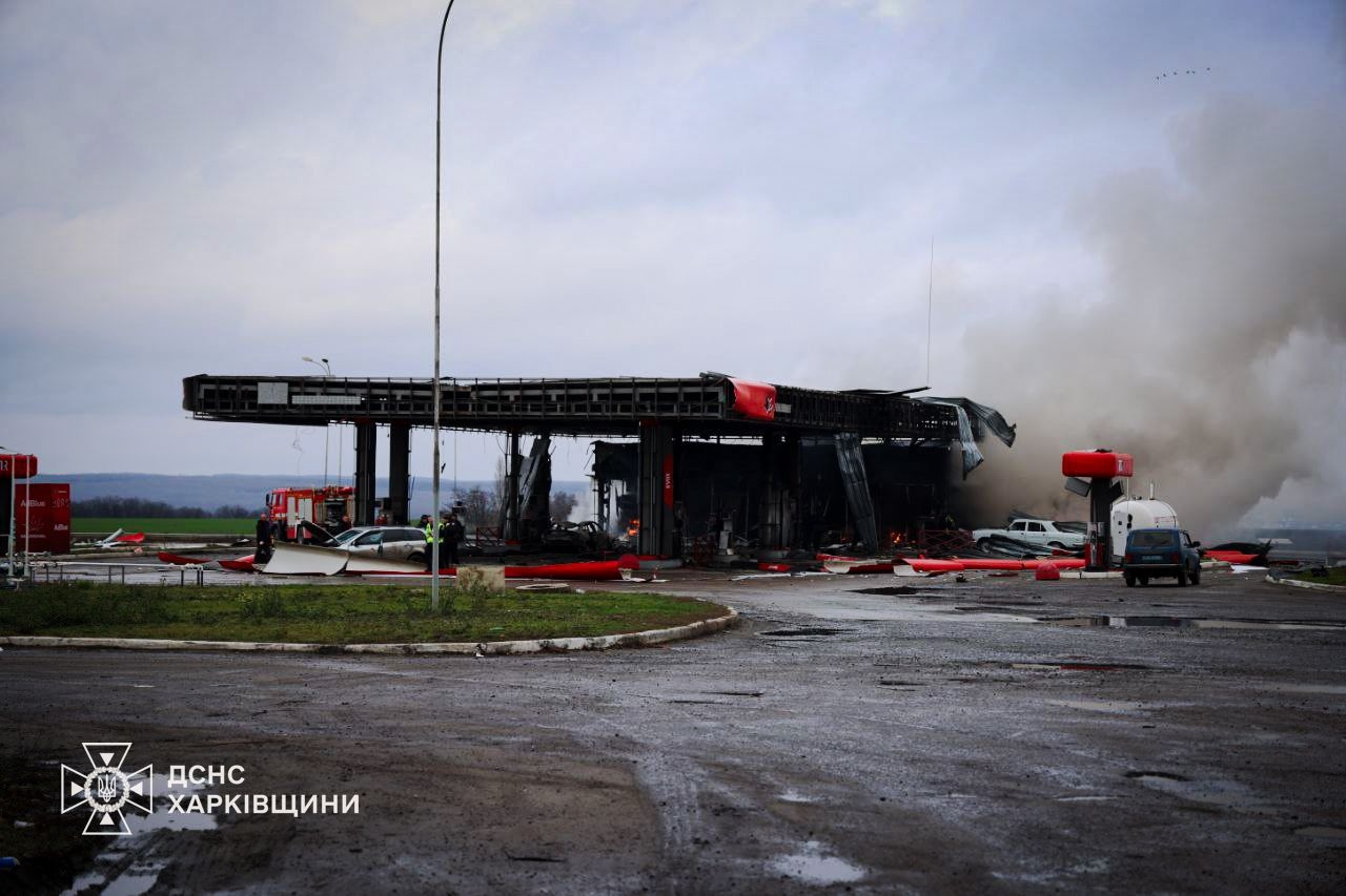 Одне з влучань було на територію автозаправної станції у Нововодолазькому районі. Сталася пожежа на площі 300 м кв. Горіли приміщення АЗС та автомобілі. За попередніми даними постраждало 6 людей.