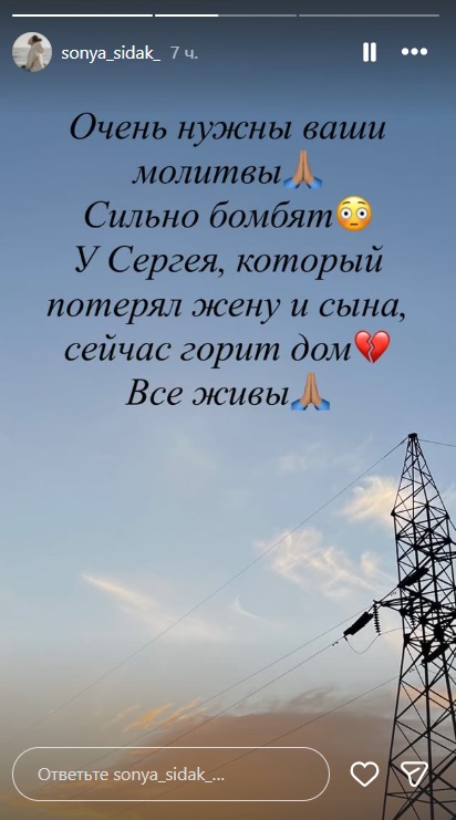 "Дуже потрібні ваші молитви. Сильно бомблять. У Сергія, який втратив дружину і сина, зараз горить будинок. Усі живі", — написала Софія.
