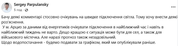 Очікувати підключення найближчим часом і навіть в найближчий тиждень не варто, — констатував посадовець, посилаючись на дані енергетиків.