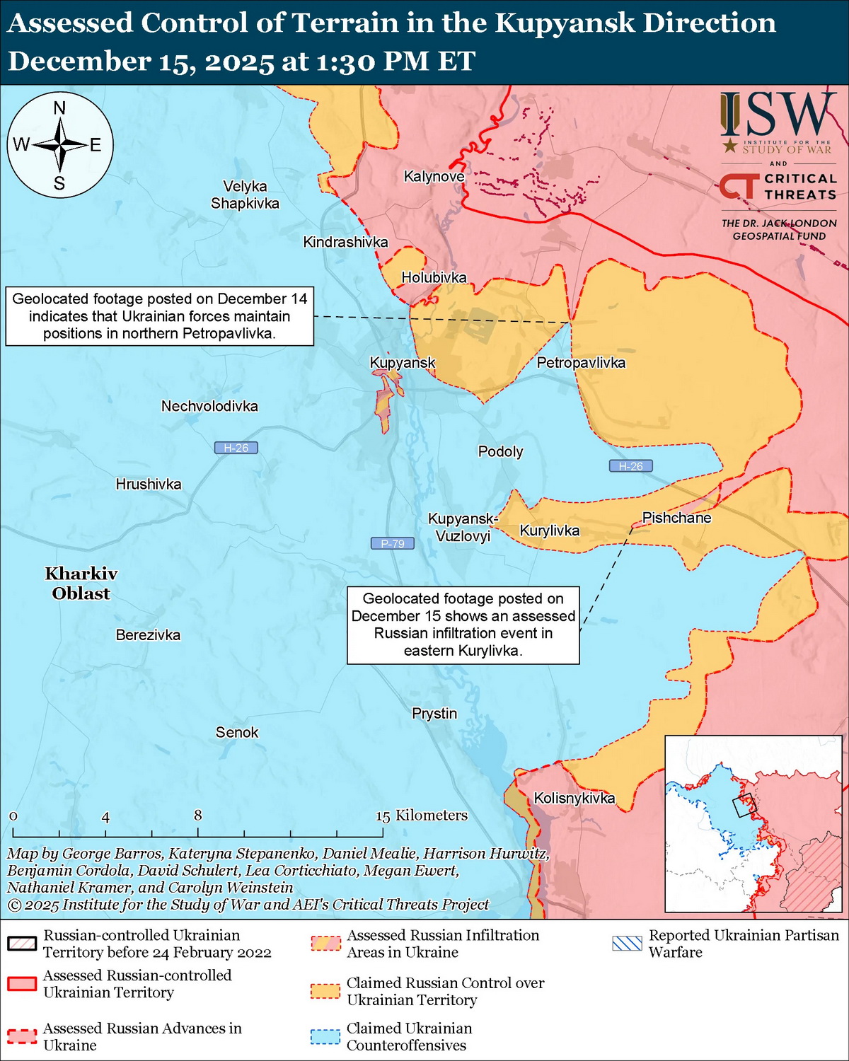 У звіті станом на 15 грудня аналітики розповіли про ситуацію в Куп'янську, ґрунтуючись на доповіді представника українського командування Віктора Трегубова, розповіді бійця бригади, яка воює на вказаному відтинку, а також на основі дописів російських мілблогерів у соцмережах. Серед іншого, записи з російських ресурсів підтверджують, що ЗСУ і далі утримують Петропавлівку, про проникнення в яку писали росЗМІ. А головний сержант БТГР 13-ї бригади Нацгвардії України "Хартія" з позивним "Аяччо" в ефірі "Еспресо" уточнив, що газогін справді взяли під вогневий контроль, а бригада займається знешкодженням 200 росіян на північних вулицях міста.