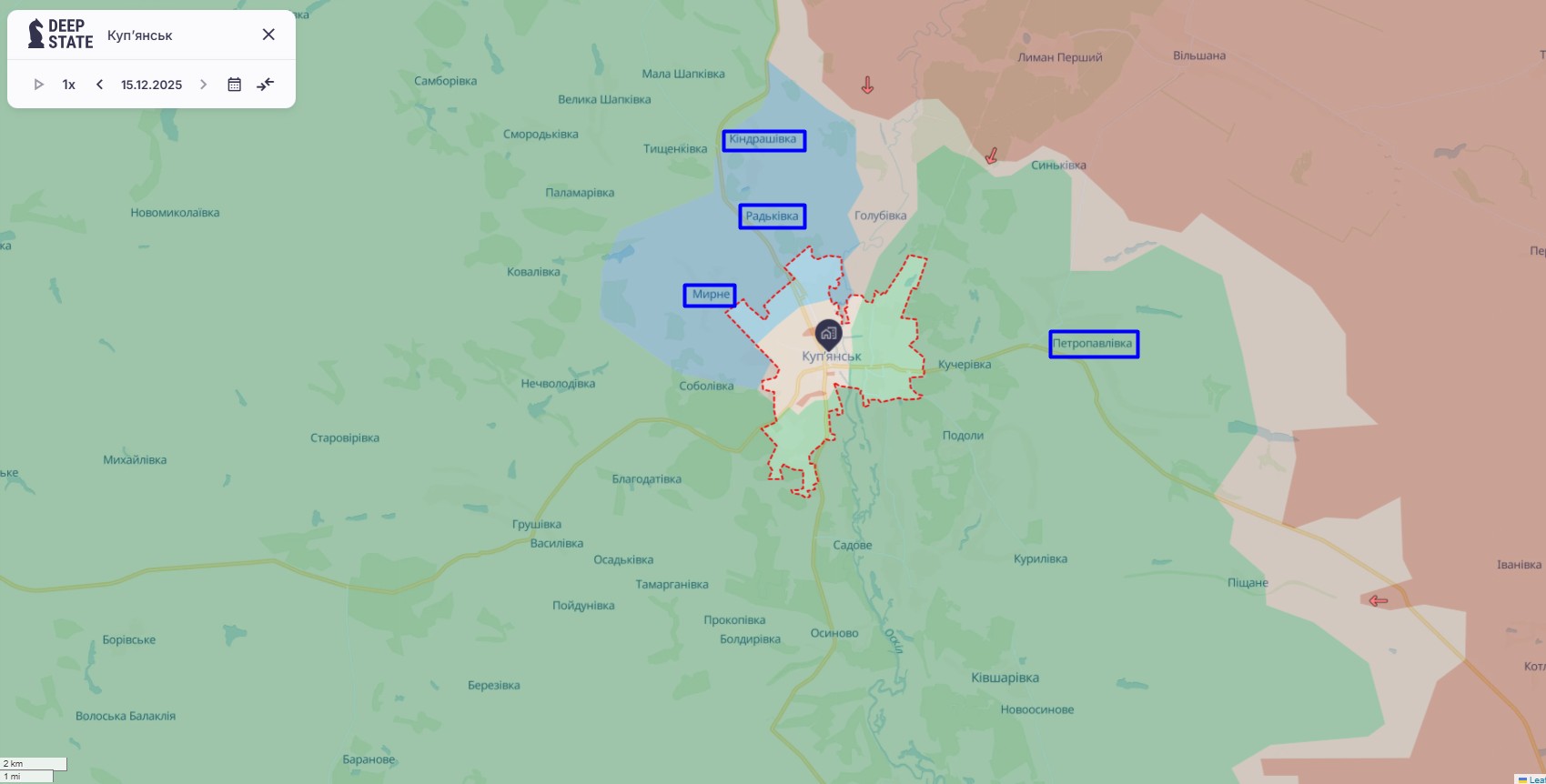 Карта лінії фронту в Куп'янську станом на 15 грудня, DeepState