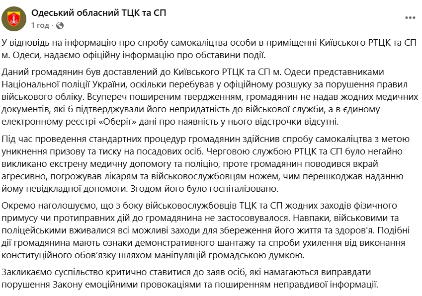 "Навпаки, військовими та поліцейськими вживалися всі можливі заходи для збереження його життя та здоров'я. Подібні дії громадянина мають ознаки демонстративного шантажу та спроби ухилення від виконання конституційного обов’язку шляхом маніпуляцій громадською думкою", — зазначили в ТЦК.