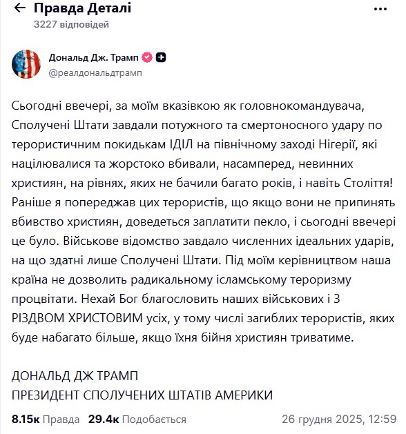 "Сполучені Штати завдали потужного та смертоносного удару по терористичним покидькам ІДІЛ на північному заході Нігерії, які націлювалися та жорстоко вбивали, насамперед, невинних християн, на рівнях, яких не бачили багато років", — написав глава Білого дому, заголосивши, що удари продовжаться, якщо "їхня бійня християн триватиме".