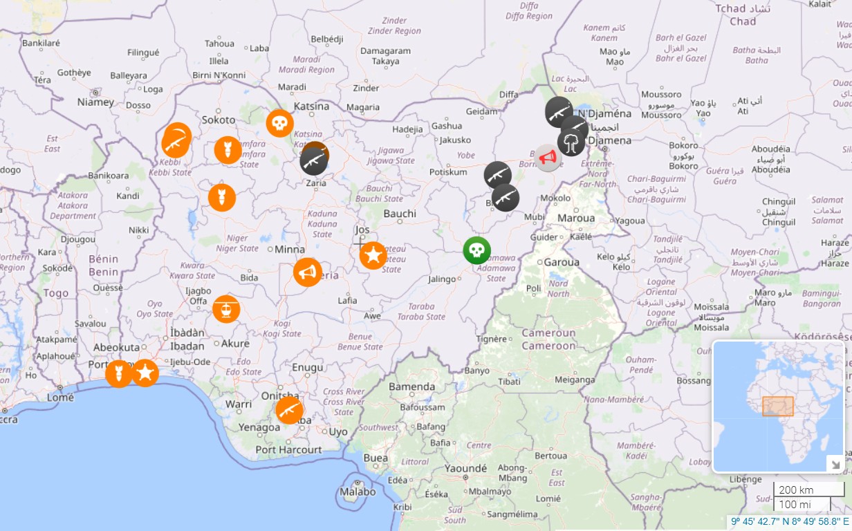 На карті Liveuamap можна відшукати інформацію про останні події в Нігерії, про заяви політиків та про напади бойовиків у цій країні. Наприклад, чотири місяці тому бойовики напали на селище Яндоку в штаті Каціна: викрали кількох жінок та худобу. Два місяці тому відбувся рейд терористів угрупування "Боко Харам" на табір "Ісламської держави — Західна Африка", при чому використовували гвинтівки китайського та ізраїльського виробництва. Сутички відбувались на північному заході Нігерії, вказано на карті.