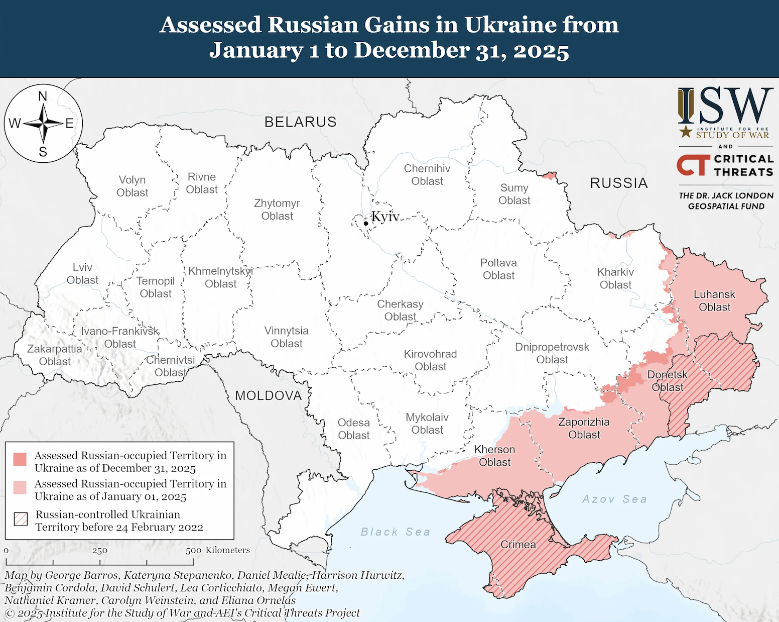 За минулий рік ЗС РФ окупували 4831 квадратний кілометр української землі, а також відвоювали приблизно 473 квадратних кілометри території Курської області. Це — 0,8% території України, у 2024 році обсяг завоювань був меншим — 3604 квадратних кілометри. Про це йдеться у звіті ISW за 31 грудня.