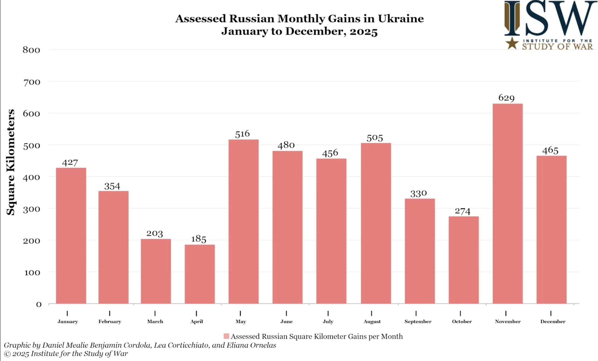 "Однак темпи просування російських військ протягом 2025 року не були стабільними. Найвищі темпи просування російських військ були зафіксовані в листопаді — 20,99 квадратного кілометра на день, але цей пік настав після одного з найповільніших місяців 2025 року — 8,8 квадратного кілометра на день у жовтні — і згодом сповільнився до 15 квадратних кілометрів на день у грудні", — зауважили аналітики.