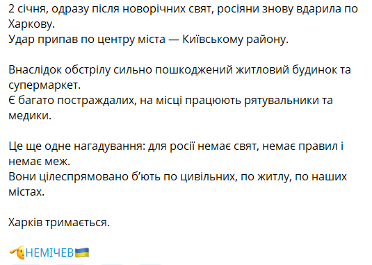 Удень 2 січня російські окупанти атакували центр Харкова. За словами мера Ігоря Терехова, є постраждалі серед цивільних.