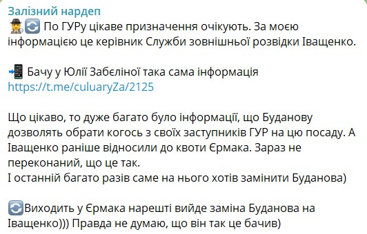 ГУР та Іващенко - допис Забєліної про нову посаду глави СЗР