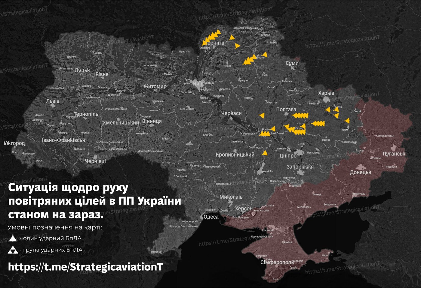 Моніторингові канали фіксують найбільшу кількість ворожих дронів на Чернігівщині, Харківщині, Полтавщині та Дніпропетровщині.