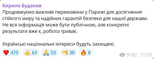 Який перший коментар Буданова про мирні переговори у Парижі: частина результатів — не публічна