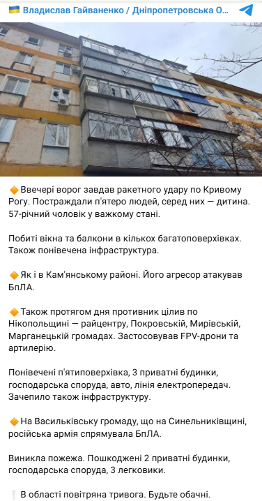"Увечері ворог завдав ракетного удару по Кривому Рогу. Постраждали п'ятеро людей, серед них дитина. 57-річний чоловік у важкому стані. Розбиті вікна та балкони в кількох багатоповерхівках. Також пошкоджено інфраструктуру", — написав він.