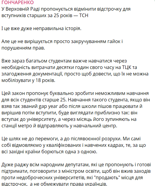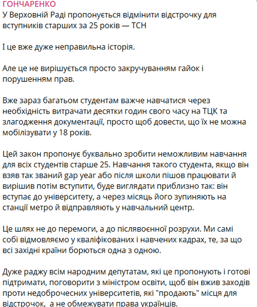 "Цей закон пропонує буквально унеможливити навчання всім студентам, старшим за 25. Навчання такого студента, якщо він узяв так званий gap year або після школи пішов працювати і вирішив потім вступити, виглядатиме приблизно так: він вступає до університету, а за місяць його зупиняють на станції метро і відправляють у навчальний центр. Це шлях не до перемоги, а до післявоєнної розрухи. Ми самі собі відмовляємо у кваліфікованих і навчених кадрах, за що всі західні країни борються одна з одною", — упевнений парламентарій.