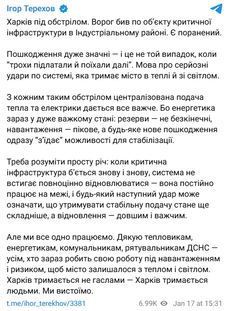 О 15:31 Ігор Терехов додав, що йдеться про "серйозні удари по системі", яка забезпечує харків'ян теплом і світлом.