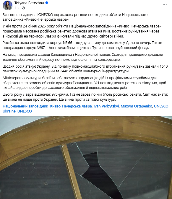 "Щодня росія атакує Україну. Від початку повномасштабного вторгнення руйнувань зазнали 1640 пам'яток культурної спадщини та 2446 об'єктів культурної інфраструктури. Міністерство культури України забезпечує координацію дій із профільними службами щодо збереження та захисту об'єктів культурної спадщини. Усі пошкодження ретельно фіксуємо, щоб якнайшвидше перейти до фахового обстеження та відновлювальних робіт. Цього року Лавра відзначає 975-річчя. І саме зараз по ній б'ють російські ракети. Світ має знати: це війна не тільки проти України. Це війна проти світової культури", — написала Бережна.
