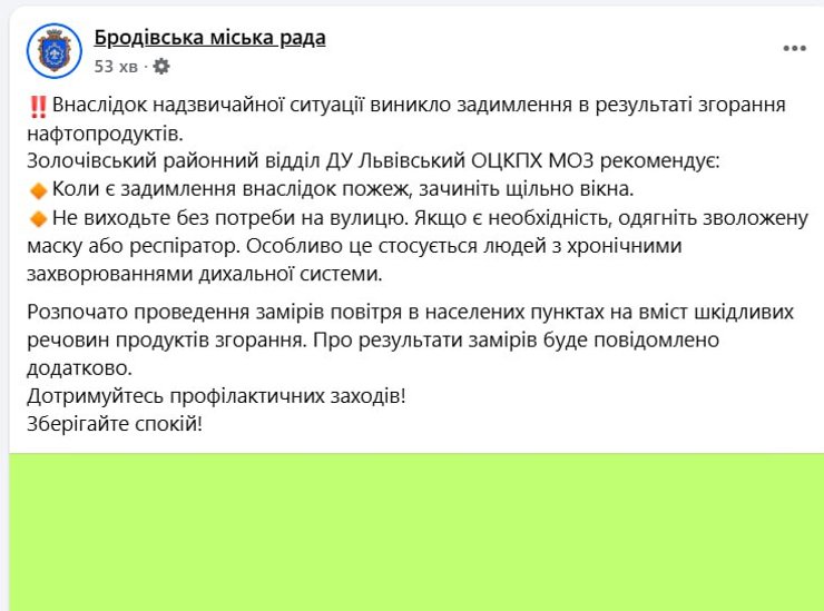 Буквально за кілька хвилин після першої публікації міськрада уточнила, що внаслідок надзвичайної ситуації виникло задимлення внаслідок згоряння нафтопродуктів. Влада повторила попередні рекомендації щодо безпеки для населення, а також порадила в разі потреби надягати зволожену маску або респіратор. Особливо це стосується людей із хронічними захворюваннями дихальної системи.