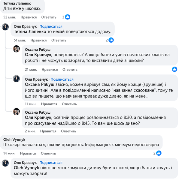 Зазначимо, що в коментарях під повідомленням мерії місцеві жителі спростовують інформацію про скасування занять і пишуть, що уроки почалися о 8:30.
