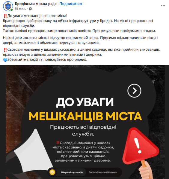 27 січня ЗС РФ атакували ударними дронами об'єкт інфраструктури у Львівській області, і вже вранці в Бродах у зв'язку з наслідками обстрілу заявили про скасування уроків у школах. Бродівська міськрада також просить не виходити зайвий раз на вулицю.