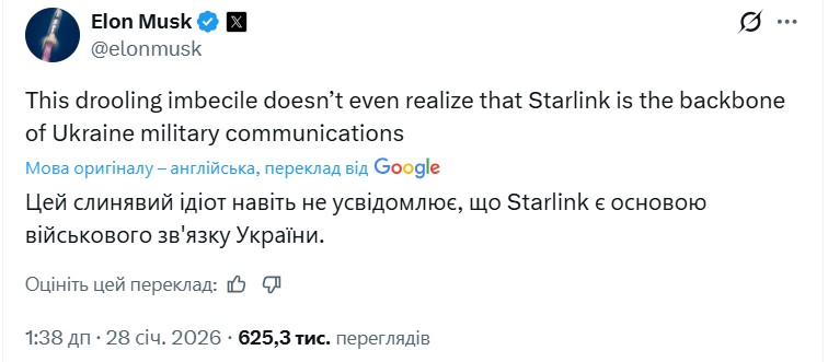 Звернення Сікорського переглянули 2 млн користувачів X. Також з'явилось понад 300 коментарів, серед них — відповідь Маска. Власник SpaceX обізвав поляка "слинявим ідіотом", ймовірно, маючи на увазі, що не вимикатиме Starlink через його важливість для ЗСУ.