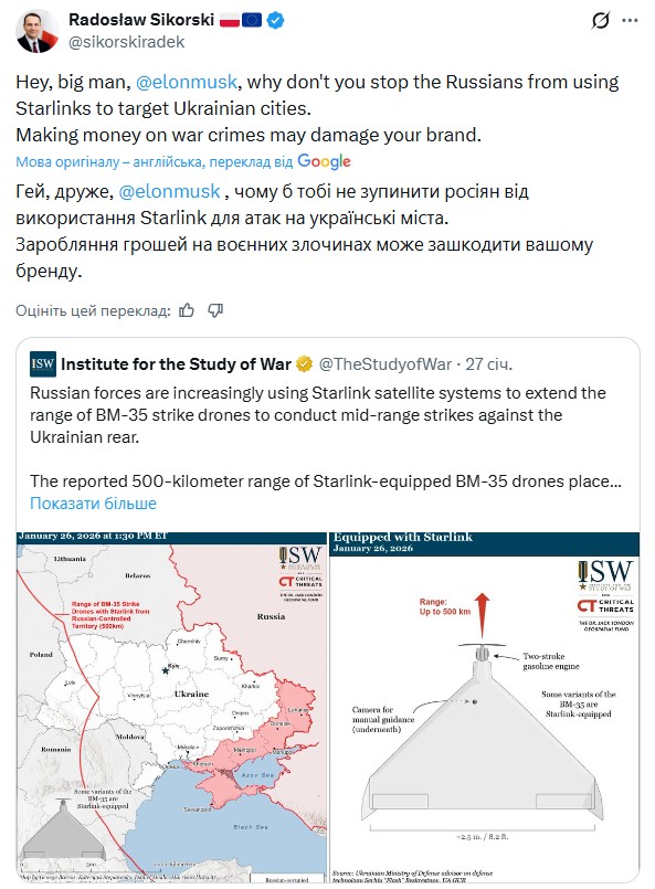 Польський політик попередив Маска, що через використання Starlink на дронах РФ мільярдер може втратити гроші. При цьому Сікорський посилався на інформацію Інституту вивчення війни про супутниковий зв'язок на дронах "Шахед" та БМ-35. Маючи такі можливості, росіяни у прямому ефірі керують прицільними ударами по українських містах, ідеться у дописі, який з'явився близько 20 год 27 січня.