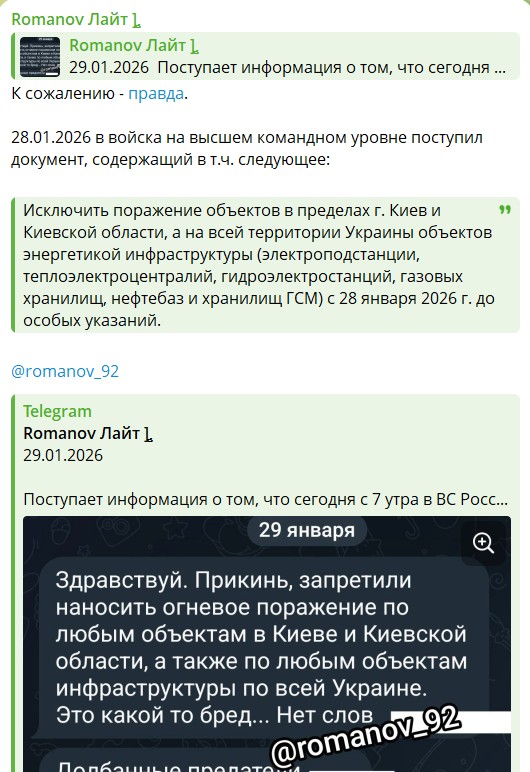 Росіяни запевняють, що не обстрілюватимуть об'єкти генерації, газові сховища, нафтобази та склади паливо-мастильних матеріалів. Початок так званого "енергетичного перемир'я" — з 7 год 28 січня 2026 року (ймовірно, за Москвою). Припинення — до нового наказу командування.
