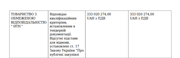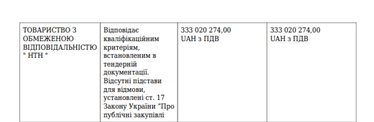 Станом на 30 січня як учасника тендеру, який відповідає кваліфікаційним критеріям, встановленим у тендерній документації, і для якого відсутні причини для відмови, зазначено ТОВ "НТН".