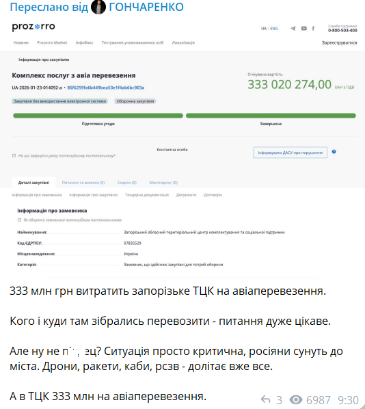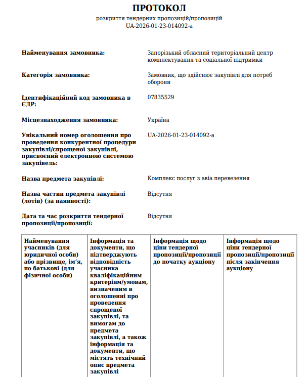 Послуги з авіаперевезень на 333 мільйони гривень замовив Запорізький обласний територіальний центр комплектування та соціальної підтримки. Тендер виграло ТОВ, яке займається будівництвом, торгівлею та туристичною діяльністю.