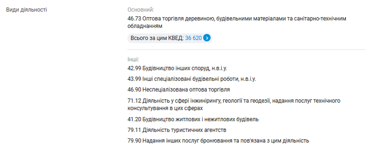 Згідно з інформацією на YouControl, ця фірма зареєстрована 2005 року. У системі зазначено, що вона займається оптовою торгівлею деревиною та будматеріалами. Серед інших напрямків — будівництво, неспеціалізована оптова торгівля та діяльність туристичних агентств.