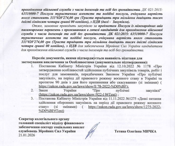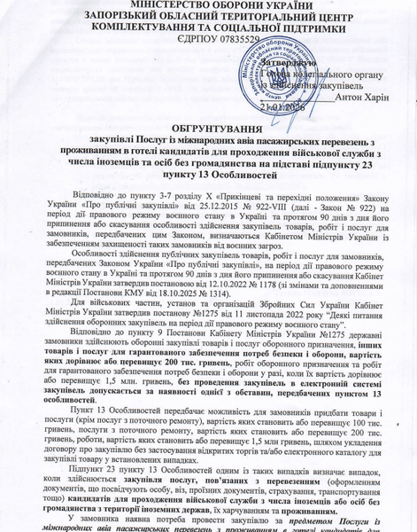 Йдеться про закупівлю послуг, пов'язаних із перевезенням (оформлення документів, що засвідчують особу, віз, проїзних документів, страхування, транспортування тощо) кандидатів для проходження військової служби з числа іноземців або осіб без громадянства з території іноземних держав, їхнім харчуванням та проживанням, йдеться на Prozorro.