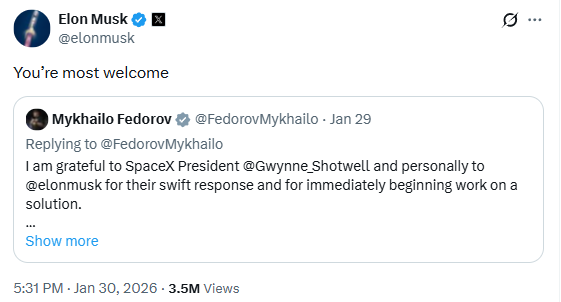 У дописі, який репостнув Маск, Федоров висловлює вдячність особисто підприємцю, а також президентці SpaceX Гвінн Шотвелл за швидку реакцію та негайний початок роботи над розв'язанням проблеми.