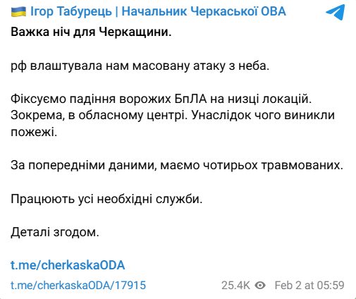 "Важка ніч для Черкащини. РФ влаштувала нам масовану атаку з неба. Фіксуємо падіння ворожих БпЛА на низці локацій. Зокрема, в обласному центрі. Унаслідок чого виникли пожежі", — написав Табурець.