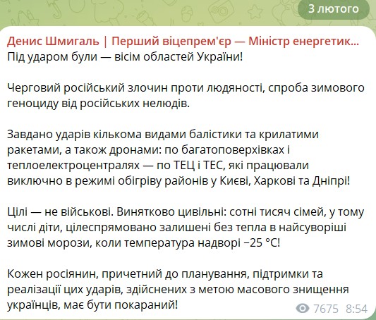 В ніч на 3 лютого від удару РФ по енергетиці постраждали об'єкти у восьми областях, ідеться у дописі міністра у Telegram-каналі. Шмигаль у уточнив, що ідеться про ТЕЦ, які обігрівали жителів Києва, Харкова та Дніпра. Атаку росіян на енергетичні об'єкти підтвердила також пресслужба ДТЕК, додавши, що це дев'ятий удар протягом п'яти останніх місяців (з жовтня 2025 по початок лютого 2026).