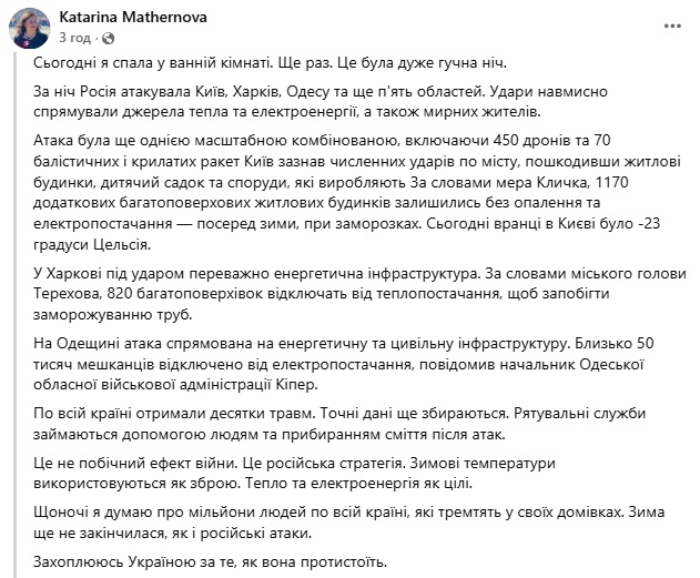 "Це не побічний ефект війни. Це російська стратегія. Зимові температури використовують як зброю. Тепло та електроенергія, як цілі. Щоночі я думаю про мільйони людей по всій країні, які тремтять у своїх домівках. Зима ще не скінчилася, як і російські атаки. Захоплююся Україною за те, як вона протистоїть", — пише Матернова.
