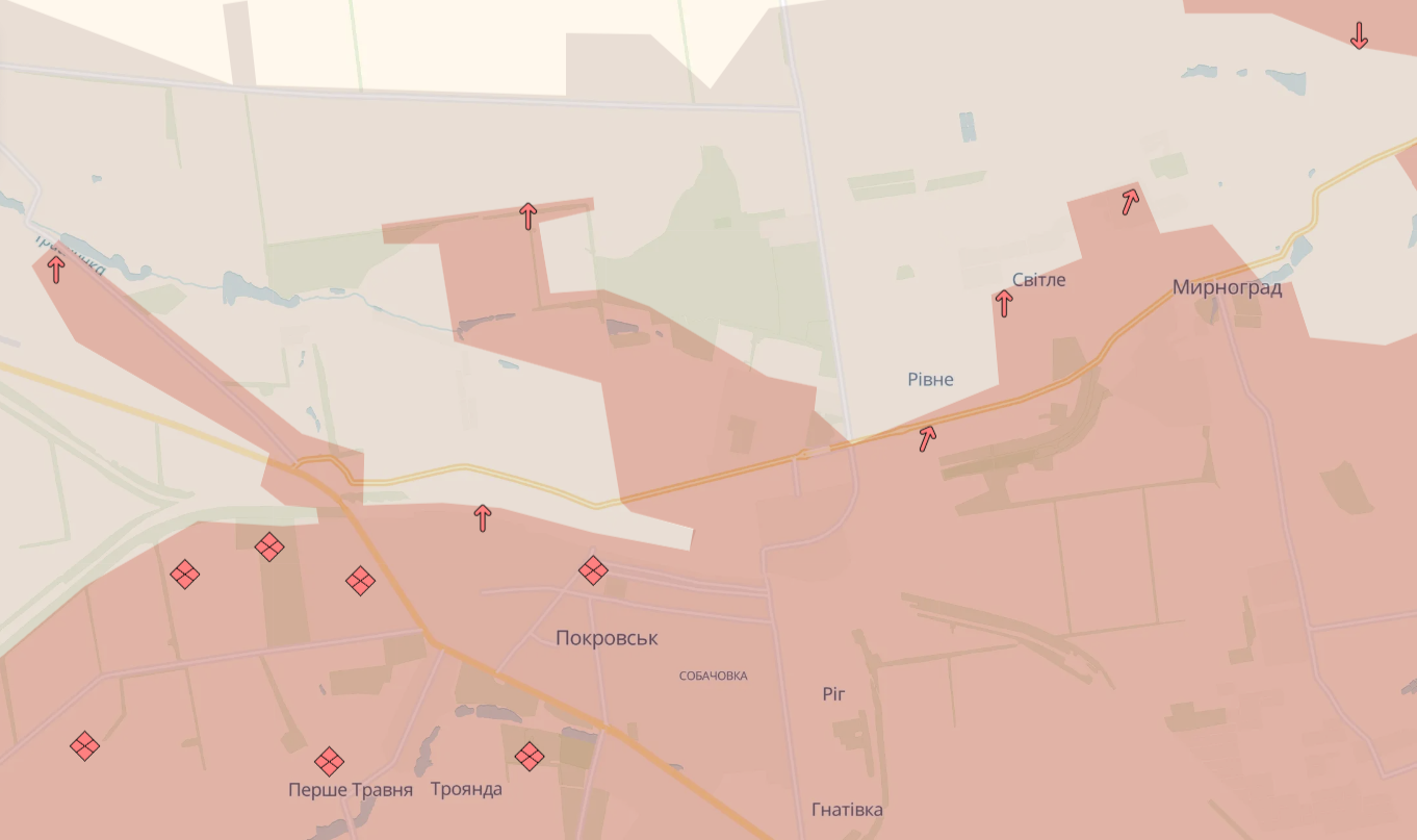 "Місто продовжує поглинатися ворогом, який окрім піхоти активно заводить свою техніку, виставляє засоби радіоелектронної розвідки, розпорошує по місцевості своїх пілотів, які дронами фактично контролюють логістику Покровсько-Мирноградської агломерації", — кажуть у DeepState.