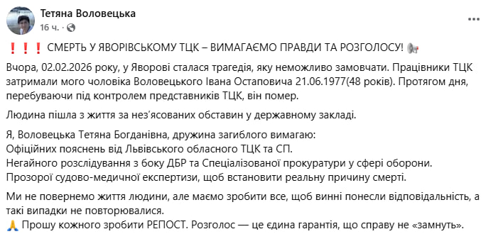 На своїй сторінці у Facebook дружина загиблого Тетяна Воловецька повідомила, що її чоловік Іван Воловецький помер 2 лютого під час перебування у Яворівському ТЦК. У публікації вона зазначила, що чоловіка затримали працівники центру, і протягом дня він перебував під їхнім наглядом.