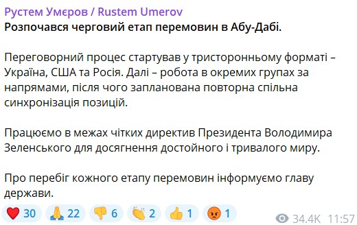 Рустем Умєров прокоментував третій раунд переговорів в Абу-Дабі 4 лютого. У Telegram-каналі посадовця з'явився допис про план зустрічей: посадовці спершу спілкуватиметься у різних переговорних групах, а потім синхронізують результати. Головна мета — досягнення "достойного та тривалого миру", ідеться у дописі Умєрова.