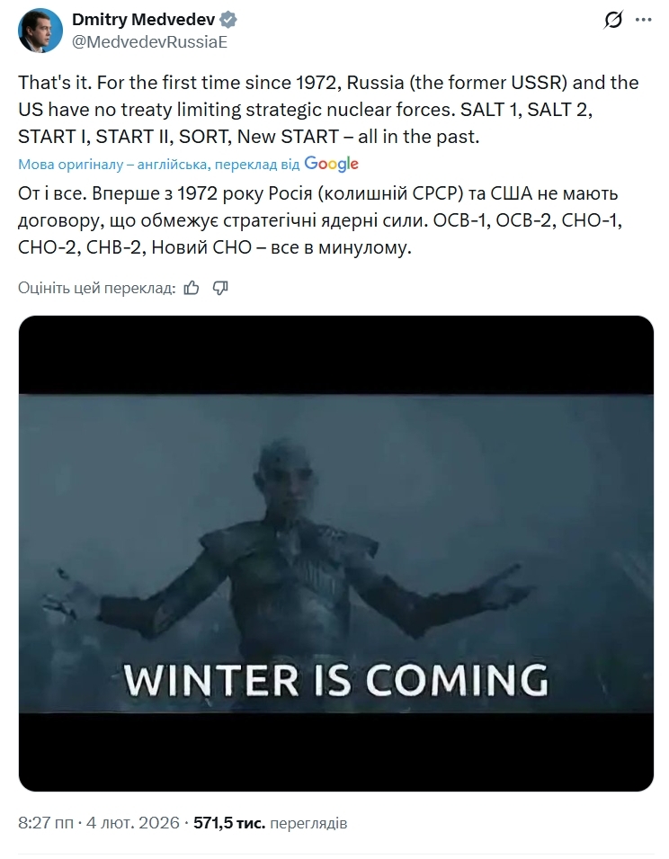 "Уперше з 1972 року у Росії (колишнього СРСР) і США немає домовленості про обмеження стратегічних ядерних сил. ОСВ-I, ОСВ-II, СНО-I, СНО-II, СНП, СНО-III — усе це в минулому", — написав Медведєв, опублікувавши скріншот із серіалу "Гра престолів".