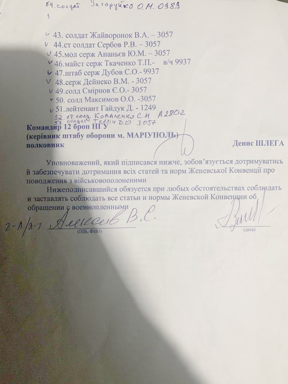 Допис Прокопенка з'явився вдень 6 лютого, через кілька годин після інформації про замах на генерала ГРУ Алексєєва. "Редис" згадав події чотирирічної давності, коли українці отримали гарантії безпеки від росіян, вийшли з "Азовсталі" і при цьому передали трьох військовополонених, яких перед цим лікували та годували. Алексєєв особисто гарантував, що РФ виконає умови Женевської конвенції, і поставив підпис на відповідному документі, який опублікували у Facebook. Бачимо список українських бійців, а нижче — власноручний підпис топофіцера ЗС РФ, який обіцяв "за будь-яких умов" гарантувати нормальні умови поводження з військовополоненими.